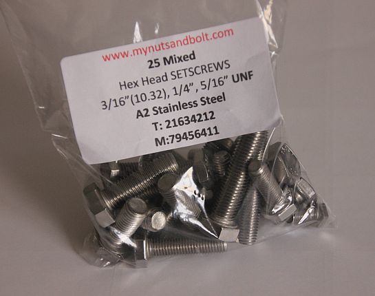 Pack contains approximately 25 assorted stainless steel UNF bolts in 1/4″, 5/16″ and 3/16″ diameters. Please note the the bolts in these assortments do not have polished heads.
